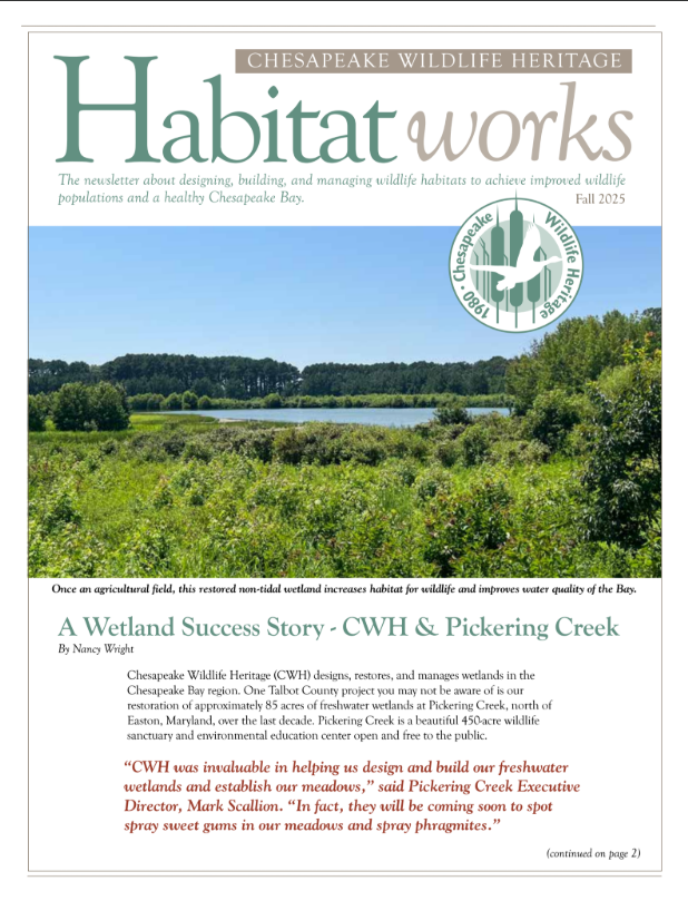 Habitat Works is our newsletter, published and distributed to our members, about designing, restoring, and managing wildlife habitat. It contains articles and information on a variety of wildlife topics and our ongoing programs and projects. Click on the date below to open the PDF.